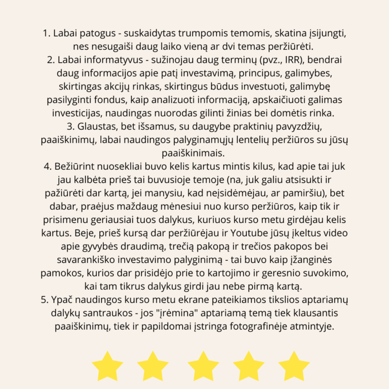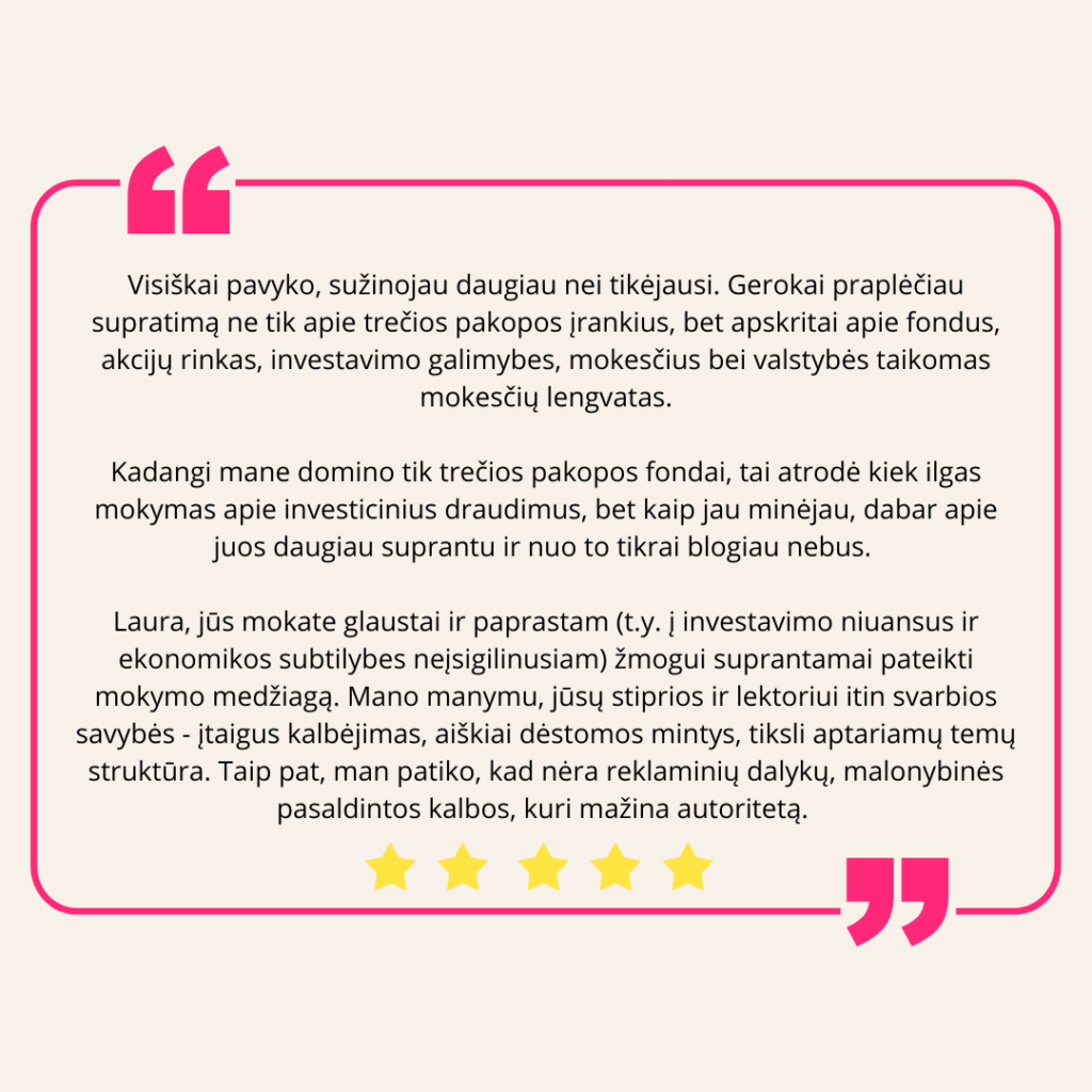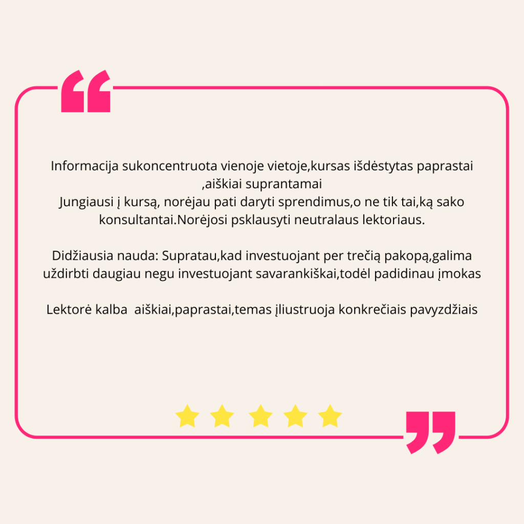 Per šį kursą (ir po jo) nebus siūloma įsigyti investicinių produktų ir/ar investavimo platformų bei nebus kviečiama į konsultaciją.