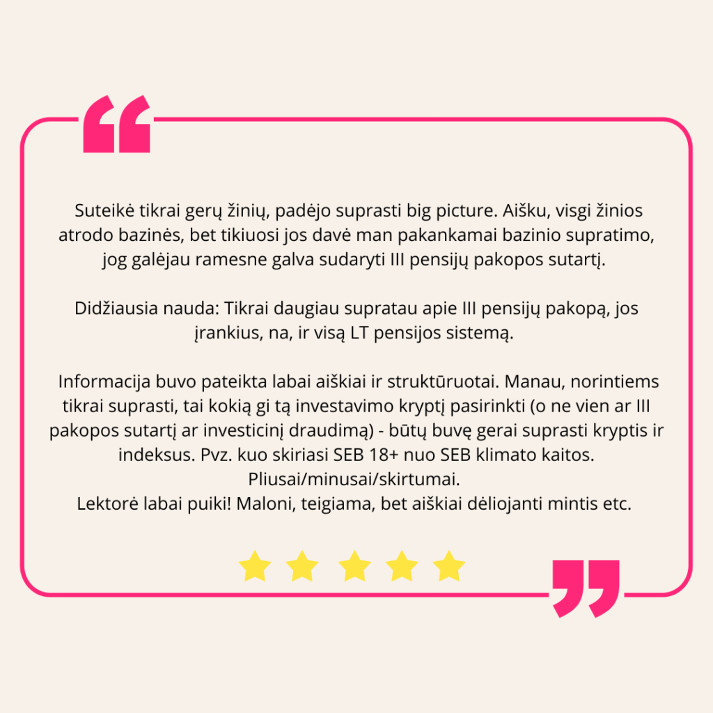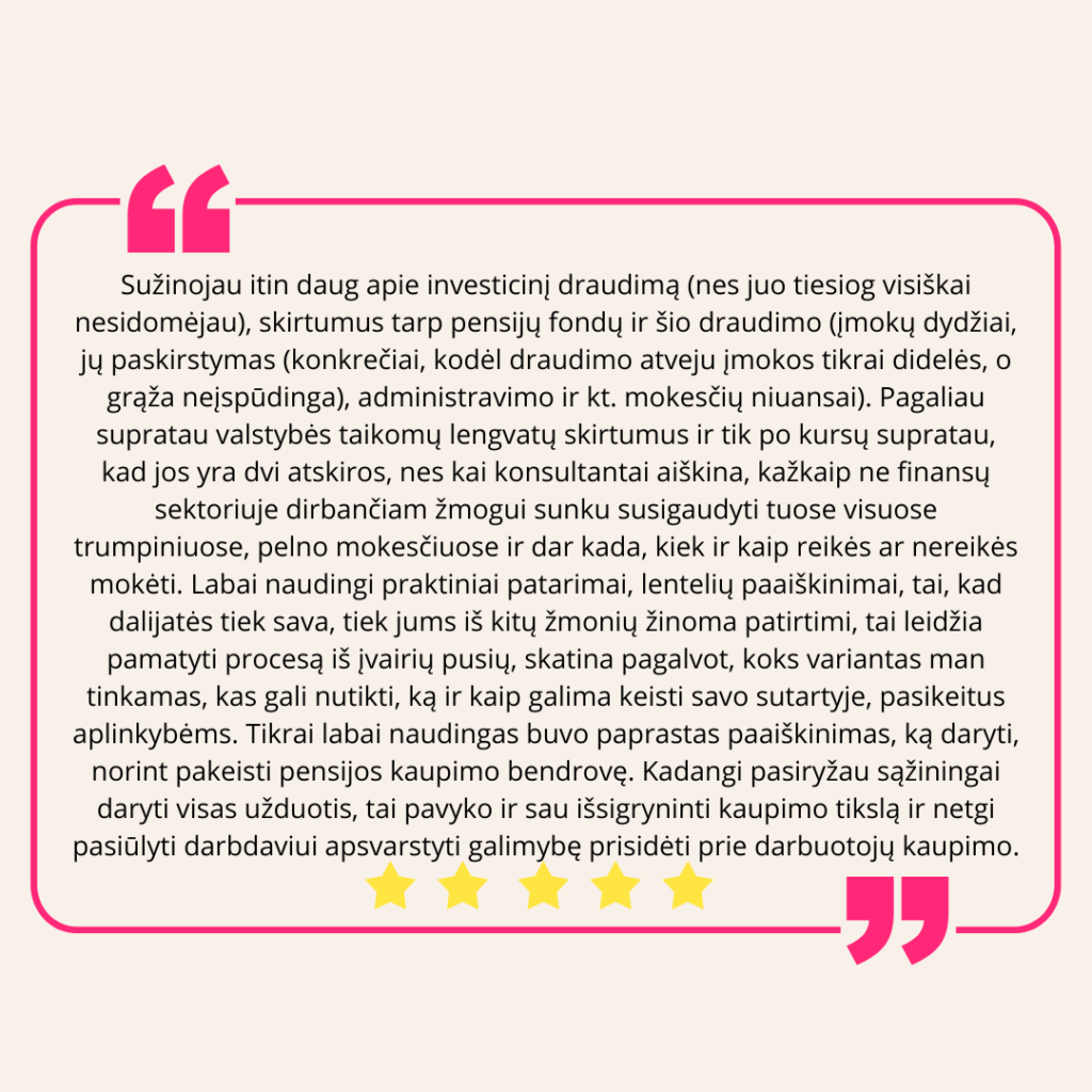 Džiaugiuosi galėdama pristatyti šį unikalų sprendimą, kuris išves tave iš tamsos apie pensijos kaupimą Lietuvoje, įneš aiškumo, suteiks žinių, padės susidėlioti savo planą.